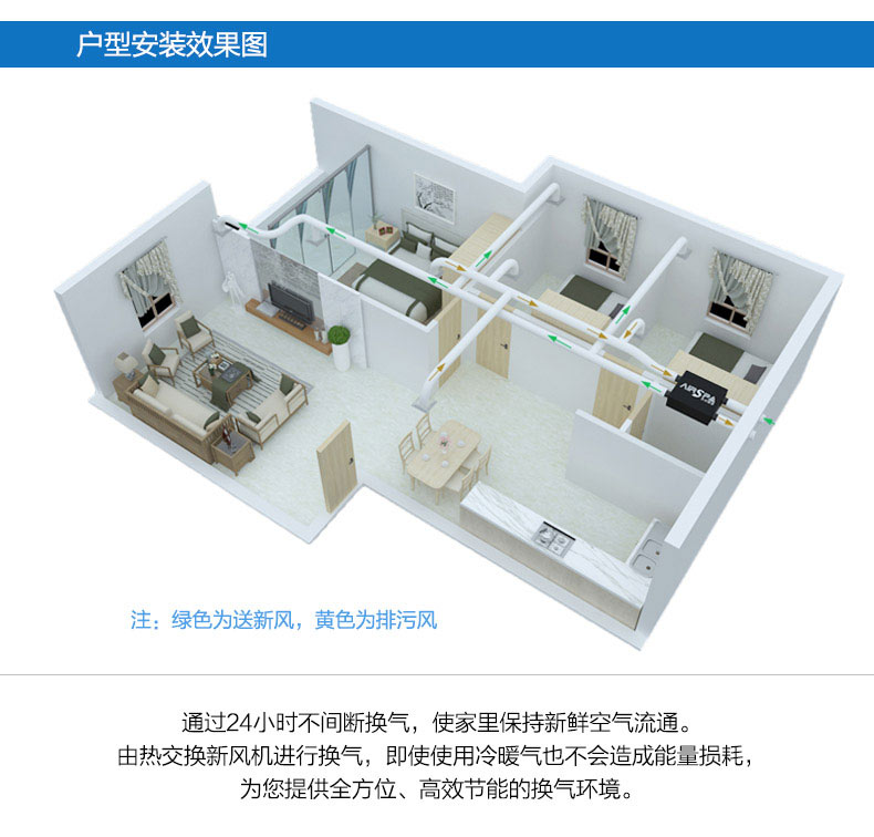 雙向流新風機:訂機采用雙核動力設計,動力強,體積小;采用直流無刷電機,低噪音,低能耗